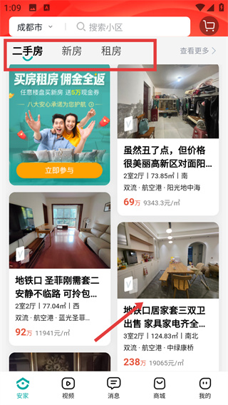 1、進入【二手房】板塊,可切換【新房】【租房】分類瀏覽房源,點擊房源卡片查看詳情,快速篩選意向房產(chǎn)。