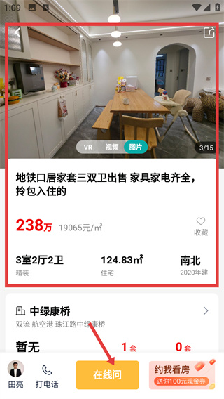 2、在房源詳情頁,可查看戶型、面積、價格等信息,點擊【在線問】按鈕,直接與經(jīng)紀(jì)人溝通房源細(xì)節(jié)。