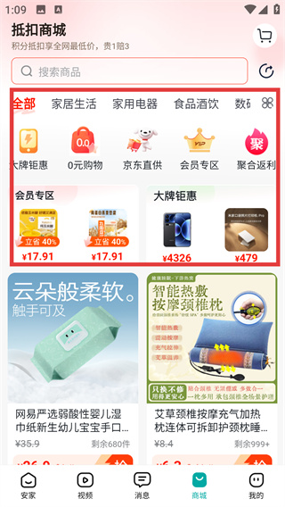 4、進入【抵扣商城】,可使用積分兌換商品,分類涵蓋家居、家電等品類,支持搜索快速查找所需物品。