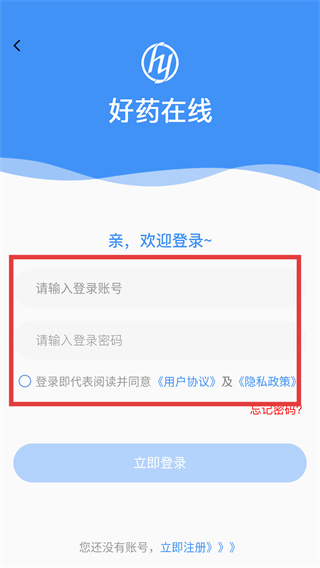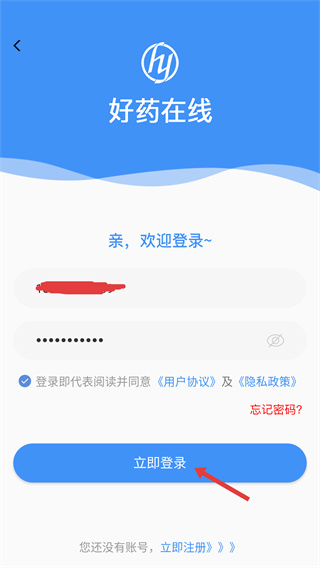 1、在【好藥在線】登錄頁,依次填寫【登錄賬號】【登錄密碼】,勾選【用戶協(xié)議-隱私政策】,完成登錄前的信息準備步驟。