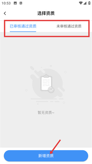 3、進入【選擇資質(zhì)】頁面,選擇【已審核通過資質(zhì)】【未審核通過資質(zhì)】的標簽,點擊【新增資質(zhì)】按鈕啟動資質(zhì)添加。
