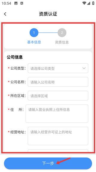 4、在【資質(zhì)認證】的【基本信息】環(huán)節(jié),填寫【公司類型】【公司名稱】等必填項后,點擊【下一步】進入資質(zhì)信息填寫環(huán)節(jié)。
