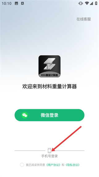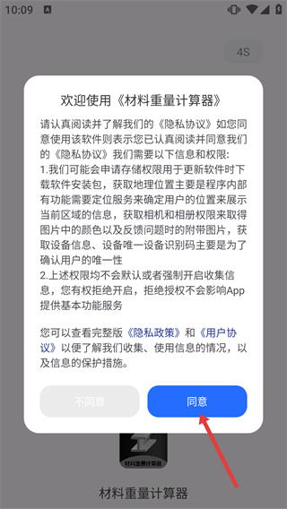 1、進入《材料重量計算器》后,閱讀其隱私協(xié)議內容,點擊“同意”按鈕,確認權限相關說明,進入軟件的登錄選擇頁面。