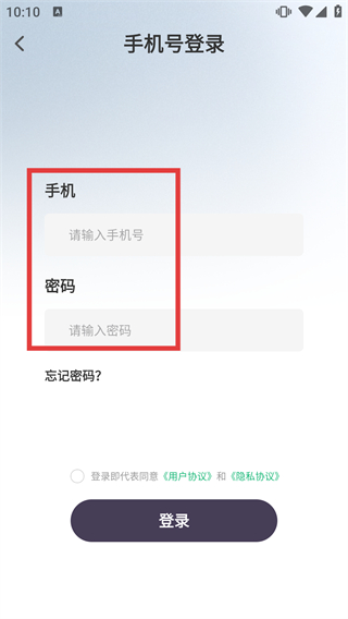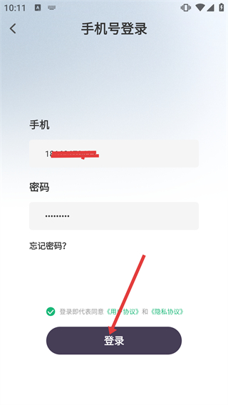 4、在手機號登錄界面填好手機號與密碼后,勾選“登錄即代表同意”對應的協(xié)議選項,點擊“登錄”按鈕,完成該軟件的賬號登錄操作。