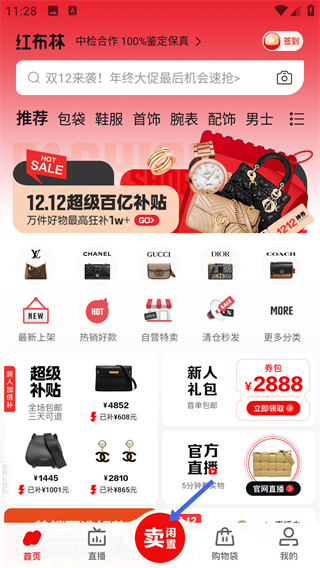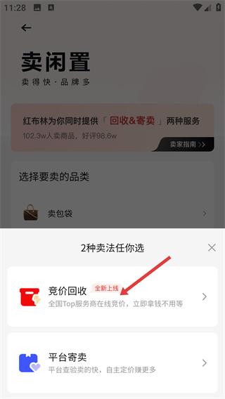 1、在首頁底部點擊【賣閑置】按鈕,進入對應(yīng)頁面,可使用平臺提供的【回收&寄賣】服務(wù)處理閑置物品。