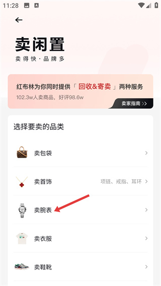 2、進入【賣閑置】頁面,選擇【賣腕表】品類,觸發(fā)賣法選擇彈窗,可挑選合適的閑置售賣方式。