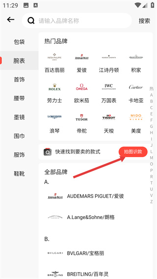 4、在品牌選擇頁,點擊【拍圖識款】按鈕,可快速識別腕表款式,也能直接選擇【熱門品牌】完成品類確認。