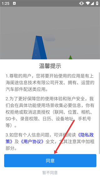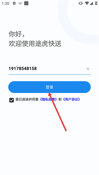 1、閱讀途虎快送的溫馨提示,了解信息收集規(guī)則后,點擊“同意”按鈕,進入應用的登錄頁面。