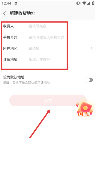 4、在新建收貨地址界面,依次填寫收貨人姓名、手機(jī)號碼、所在地區(qū)、詳細(xì)地址等信息,填寫完成后點(diǎn)擊“保存”按鈕,完成收貨地址的添加操作。