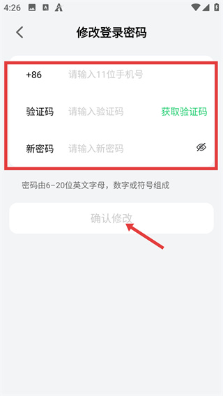 4、在修改登錄密碼頁面填寫手機號、驗證碼及新密碼,確認信息后點擊“確認修改”完成操作。