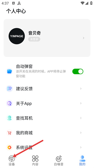 1、在個(gè)人中心頁面點(diǎn)擊底部的“設(shè)備”選項(xiàng),切換到與音貝奇耳機(jī)相關(guān)的設(shè)備操作界面。