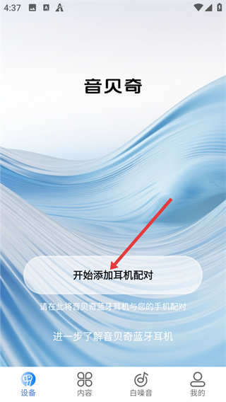 2、在設(shè)備頁面點(diǎn)擊“開始添加耳機(jī)配對(duì)”按鈕,進(jìn)入用于搜索音貝奇耳機(jī)的操作頁面。