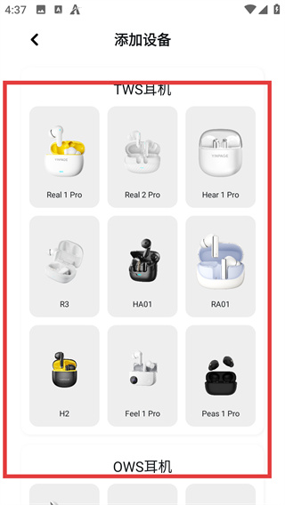 4、在添加設(shè)備頁面,從耳機(jī)分類里選擇對(duì)應(yīng)型號(hào),完成音貝奇耳機(jī)的設(shè)備添加操作。