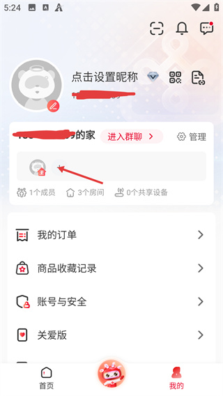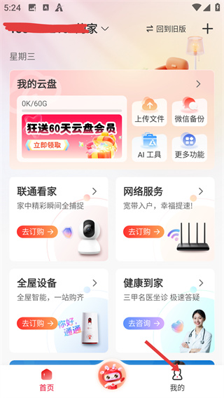 1、在首頁點(diǎn)擊底部“我的”選項(xiàng),進(jìn)入聯(lián)通智家的個(gè)人中心頁面,可查看賬號(hào)、家庭群組等功能模塊。