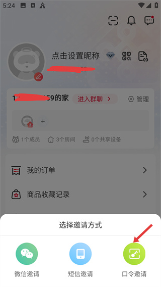3、在邀請(qǐng)方式選擇窗口中,選擇“口令邀請(qǐng)”選項(xiàng),生成家庭邀請(qǐng)口令及對(duì)應(yīng)鏈接并復(fù)制到剪切板。