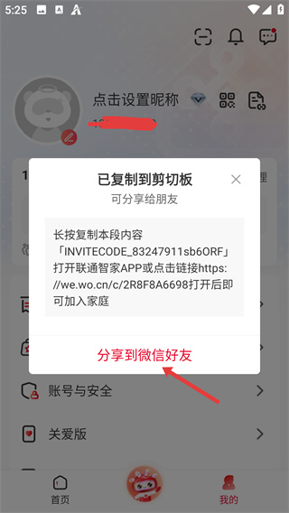 4、口令復(fù)制完成后,點(diǎn)擊“分享到微信好友”,將邀請(qǐng)信息發(fā)送給目標(biāo)成員,完成家庭邀請(qǐng)操作。