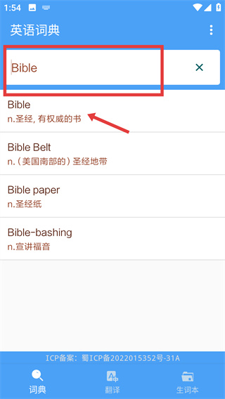 2、在搜索框輸入【Bible】,頁(yè)面會(huì)展示該單詞的基礎(chǔ)釋義及相關(guān)詞組搭配,便于快速了解其核心含義。