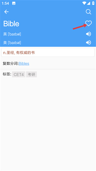 3、點(diǎn)擊搜索結(jié)果里的【Bible】條目進(jìn)入詳情頁(yè),可查看其英美式音標(biāo)、釋義,點(diǎn)擊愛(ài)心按鈕收藏該單詞。