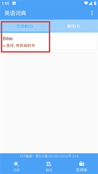 4、點(diǎn)擊底部【生詞本】選項(xiàng)進(jìn)入對(duì)應(yīng)頁(yè)面,可查看已收藏的【Bible】單詞及其釋義內(nèi)容,方便后續(xù)復(fù)習(xí)。