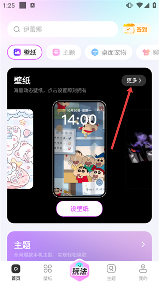 1、在壁紙類APP的“玩法”頁面,找到“壁紙”板塊并點(diǎn)擊右上角的【更多】按鈕,進(jìn)入壁紙的分類列表頁面。