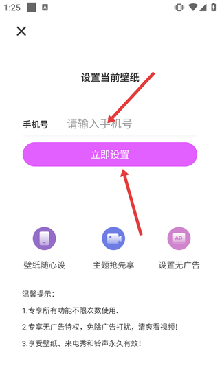4、在“設(shè)置當(dāng)前壁紙”彈窗中,輸入手機(jī)號(hào)后點(diǎn)擊【立即設(shè)置】按鈕,完成該壁紙的設(shè)置操作。