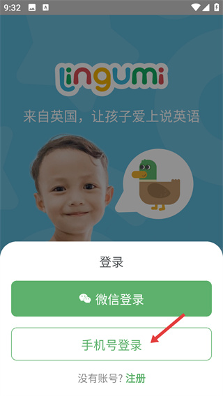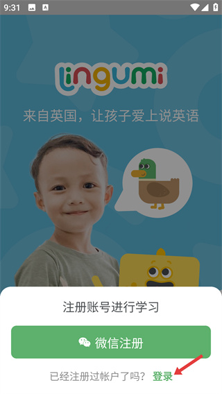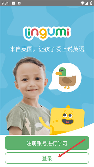 1、進(jìn)入【Lingumi】應(yīng)用初始頁(yè),該應(yīng)用主打兒童英語(yǔ)啟蒙,點(diǎn)擊頁(yè)面中的【登錄】按鈕,進(jìn)入登錄相關(guān)選項(xiàng)頁(yè)面。