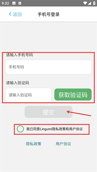 4、進(jìn)入【手機(jī)號(hào)登錄】頁(yè)面,填寫(xiě)手機(jī)號(hào)、獲取并輸入驗(yàn)證碼,勾選協(xié)議后點(diǎn)擊【提交】,完成賬號(hào)登錄流程。