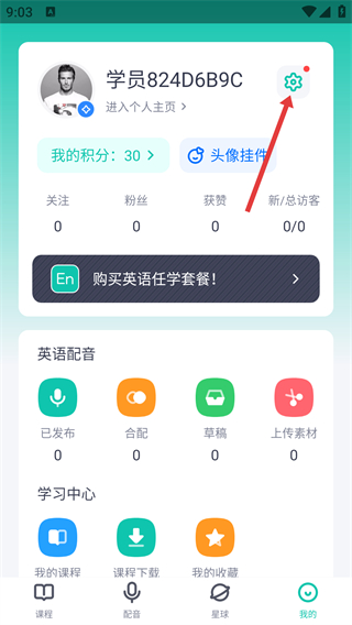 1、在【配音】頁面,點(diǎn)擊底部導(dǎo)航欄的【我的】選項(xiàng),進(jìn)入個人中心頁面,可查看積分、英語配音等功能入口。