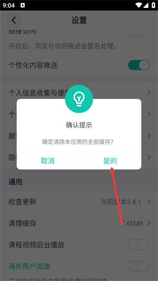 4、彈出【確認(rèn)提示】彈窗后,點(diǎn)擊【是的】按鈕,確認(rèn)清除本應(yīng)用的全部緩存數(shù)據(jù),完成緩存清理操作。