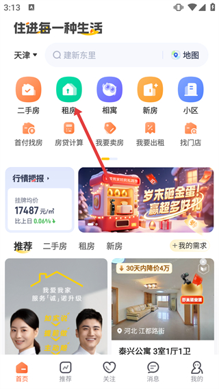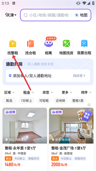 1、進(jìn)入首頁(yè)后,選定【天津】城市,點(diǎn)擊【租房】功能入口,進(jìn)入租房專區(qū)開啟找房流程。