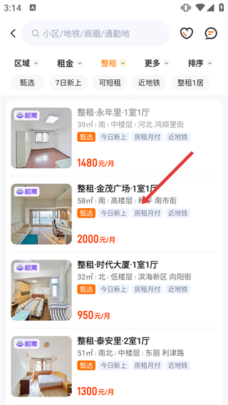 3、在整租房源列表中,查看各房源的【價(jià)格】-【面積】信息,選擇適配的房源進(jìn)入詳情頁(yè)。