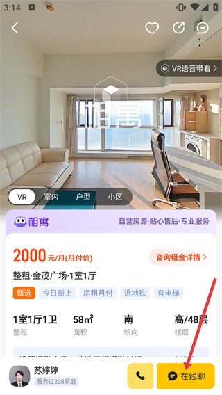 4、進(jìn)入房源詳情頁(yè)后,可使用【VR語(yǔ)音帶看】,點(diǎn)擊【在線聊】按鈕咨詢房源相關(guān)細(xì)節(jié)。