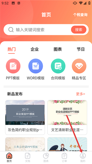 2、進(jìn)入首頁可查看【PPT模板】【W(wǎng)ORD模板】等資源分類,瀏覽熱門模板內(nèi)容,點(diǎn)擊底部【我的】按鈕進(jìn)入個(gè)人中心頁面。