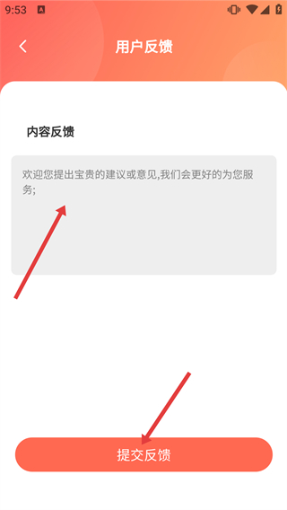 4、進(jìn)入【用戶反饋】頁面后,在【內(nèi)容反饋】輸入框填寫相關(guān)內(nèi)容,完成后點(diǎn)擊【提交反饋】按鈕,即可提交你的意見。