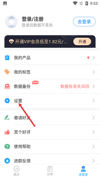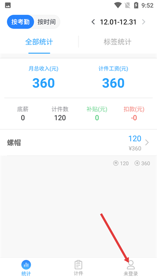 1、在統(tǒng)計頁面查看【月總收入(元)】-【計件工資(元)】等數(shù)據(jù)后,點擊底部【未登錄】按鈕進入個人相關頁面。
