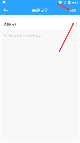 4、在底薪設置頁面輸入【底薪(元)】的數(shù)值后,點擊右上角【完成】按鈕保存該設置。
