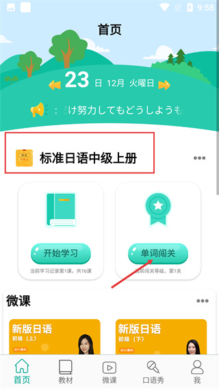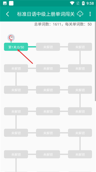 1、在首頁【標(biāo)準(zhǔn)日語中級上冊】模塊,點(diǎn)擊【單詞闖關(guān)】按鈕,進(jìn)入對應(yīng)的單詞闖關(guān)關(guān)卡頁面。
