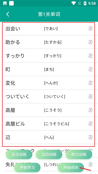 3、在第1關(guān)單詞界面,可查看如【出會い-であい】等單詞及對應(yīng)假名,點(diǎn)擊【開始闖關(guān)】按鈕進(jìn)入單詞測試環(huán)節(jié)。
