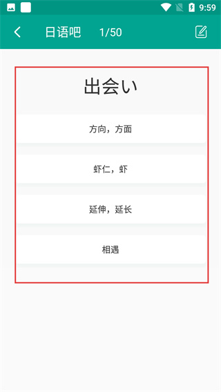 4、進(jìn)入單詞測試頁面后,需為【出會い】選擇正確釋義,完成該題即可繼續(xù)挑戰(zhàn)后續(xù)單詞的闖關(guān)任務(wù)。