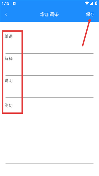 4、在增加詞條頁面,依次填寫“單詞”“解釋”“說明”“例句”等信息后,點擊右上角【保存】按鈕,完成自定義詞條的添加。