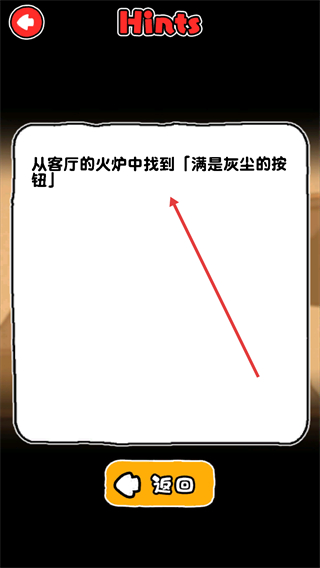4、根據提示內容,在客廳火爐中尋找「滿是灰塵的按鈕」,推進游戲進程。