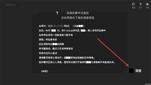 4、閱讀完事件記錄后,點擊界面右下角的【調(diào)查】按鈕,繼續(xù)游戲流程。