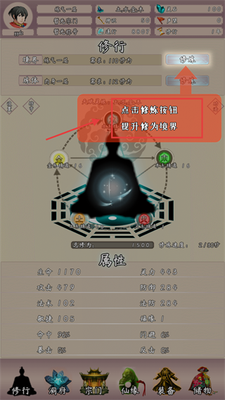 2、在修煉界面點(diǎn)擊修煉按鈕提升修為境界,積累修為解鎖煉丹煉器等更多玩法。