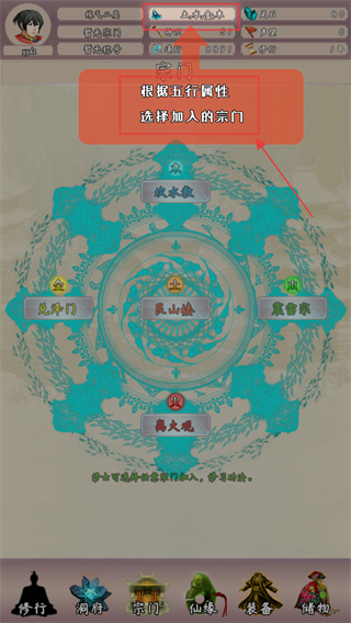 4、根據(jù)自身五行屬性選擇對應(yīng)宗門加入,學(xué)習(xí)專屬功法增強(qiáng)實(shí)力邁向更高境界。