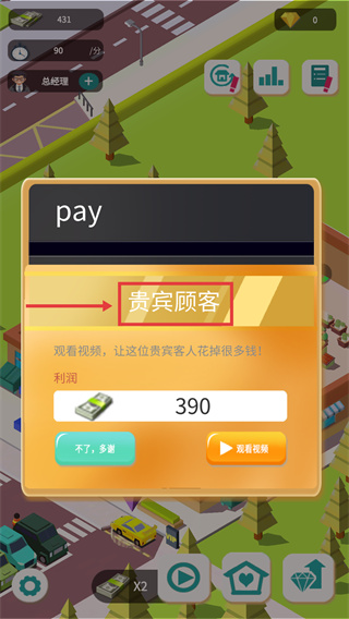 1、遇到【貴賓顧客】彈窗時(shí),點(diǎn)擊【觀看視頻】可獲得【390-利潤(rùn)】,快速積累金幣資源以支持后續(xù)經(jīng)營(yíng)升級(jí)。