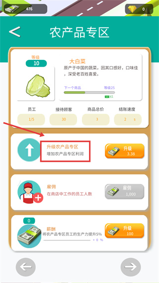 3、點(diǎn)擊【農(nóng)產(chǎn)品專區(qū)】進(jìn)入其界面,該區(qū)域是賣場(chǎng)核心收益模塊之一,可通過升級(jí)提升利潤(rùn)效率。