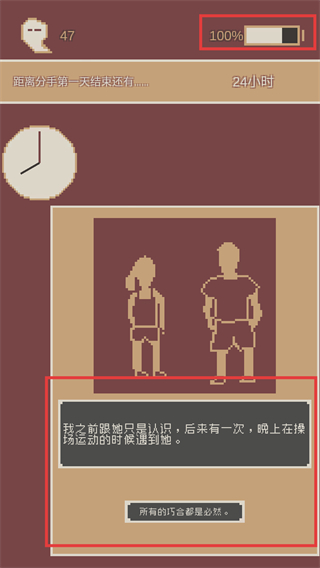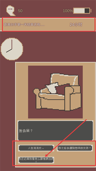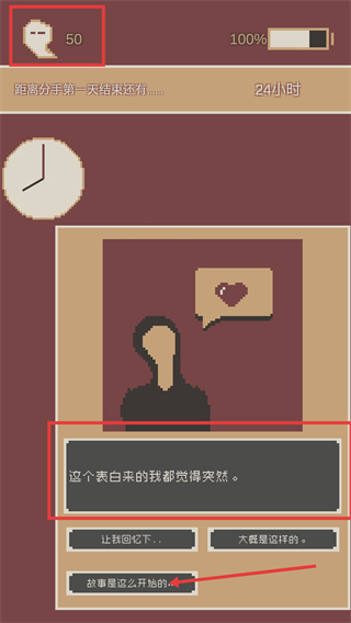 2、留意【距離分手第一天結(jié)束還有……-24小時(shí)】的倒計(jì)時(shí),選擇如【我還記得我是怎么跟她表白的。】的選項(xiàng)推進(jìn)劇情。