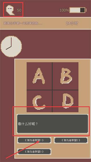 2、面對【看什么好呢?】的選擇,可挑選【《復(fù)仇者聯(lián)盟1》】這類選項推進(jìn)劇情,此時【50】的狀態(tài)數(shù)值暫未變化。