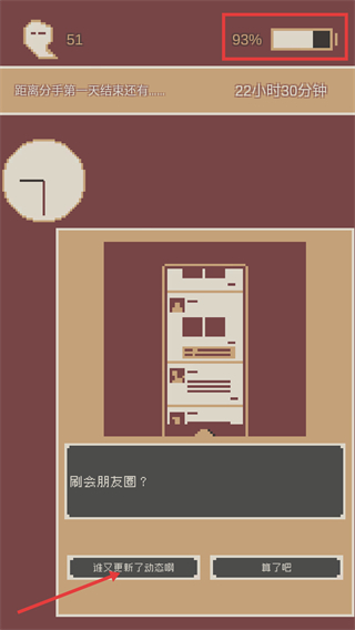 3、狀態(tài)數(shù)值變?yōu)椤?1】、進(jìn)度【93%】時,看到【刷會朋友圈?】的選項,選【誰又更新了動態(tài)啊】推進(jìn)流程。