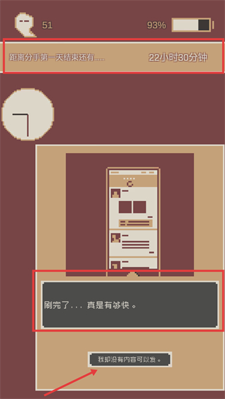 4、完成朋友圈操作后,出現(xiàn)【刷完了…真是有夠快。】的提示,后續(xù)會觸發(fā)【我卻沒有內(nèi)容可以發(fā)?!康膭∏榛印?